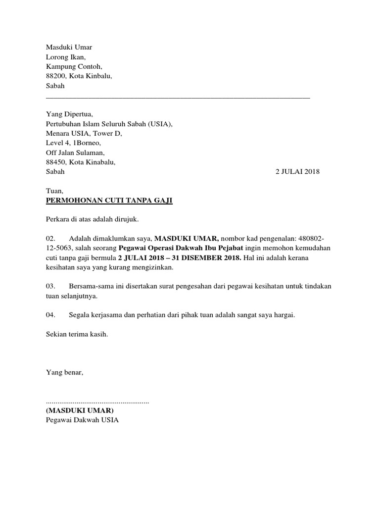 Ini Cara Claim Rm600 Dari Perkeso Jika Majikan Paksa Anda Ambil Cuti Tanpa Gaji Edu Bestari from edubestari.com Contoh surat minta cuti contoh 0917. Borang permohonan cuti newhairstylesformen2014.com via www.newhairstylesformen2014.com. Larasati eksi haliza tempat tanggal lahir : 15 januari dengan surat ini bermaksud untuk mengajukan permohonan kenaikan gaji kepada pihak perusahaan sebesar 15% dari gaji terakhir yang saya terima. Surat permohonan cuti bisa diajukan jika syarat untuk mendapatkan cuti sudah terpenuhi tentunya. Cuti tanpa gaji (ctg) (urusan persendirian). Dalam tempoh empat tahun yang lepas anggota ini tidak pernah diberi cuti tanpa gaji. Berdasarkan uu nomor 13 tahun 2003 tersebut, lama cuti menikah tanpa potongan gaji yaitu selama 3 hari kerja.